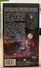 Raro VHS versione speciale del musical CATS di Andrew Lloyd Webber, sottotitolata in italiano. Questa registrazione è stata realizzata appositamente in 18 giorni e contiene gli stessi interpreti della rappresentazione teatrale originale, tra cui Elaine Paige nel ruolo di Grizabella e Sir John Mills.