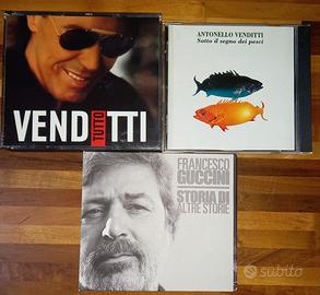 Vendo 21 CD originali: Francesco Guccini: "Storia di altre storie" "Radici" Eduardo Bennato:"Burattino senza fili"; "L’Isola che non c’è";"I buoni e i cattivi";"Non farti cadere le bracci"; Venditti:"Tutto"; "Sotto il segno dei pesci";Claudio Baglioni:"Questo piccolo grande amore"; "Claudio Baglioni". Carmen Consoli:"Due parole";"Stato di necessità".Francesco De Gregori:"Il bandito e il campione" "Rimmel". Fabrizio De Andre': "Peccati di gioventù" "Non al denaro non all'amore né al cielo" "Rimini". Lucio Battisti: "Emozioni".