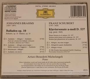 CD originale Deutsche Grammophon con registrazioni pianistiche di alto livello eseguite da Arturo Benedetti Michelangeli. Contiene: Johannes Brahms – 4 Ballate op. 10 Franz Schubert – Sonata per pianoforte in la minore D. 537 Registrazione digitale (prima edizione DG anni ’80, Made in West Germany), molto apprezzata per qualità interpretativa e sonora. Condizioni: CD usato in buone condizioni. Disco ben conservato senza graffi evidenti. Custodia e libretto completi, con normali segni del tempo (come da foto).