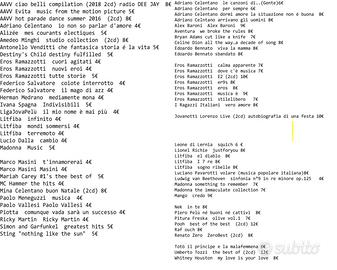 I Cd hanno basso prezzo perché possono avere qualche segnetto che non preclude la qualità dell'ascolto ,o avere la custodia o la copertina non in perfette condizioni AAVV ciao belli compilation (2018 2cd) radio DEE JAY 8€ AAVV Evita music from the motion picture 5€ AAVV hot parade dance summer 2016 (2cd) 8€ Adriano Celentano io non so parlar d'amore 4€ Alizée mes courants electiques 5€ Amedeo Minghi studio collection (2cd) 8€ Antonello Venditti che fantasica storia é la vita 5€ Destiny's Child destiny fulfilled 5€ Eros Ramazzotti cuori agitati 4€ Eros Ramazzotti nuovi eroi 4€ Eros Ramazzotti tutte storie 5€ Federico Salvatore coiote interrotto 4€ Federico Salvatore il mago di azz 4€ Herman Medrano mediamente mona 4€ Ivana Spagna Indivisibili 5€ LigaJovaPelù il mio nome è mai più 4€ Litfiba infinito 4€ Litfiba mondi sommersi 4€ Litfiba terremoto 4€ Lucio Dalla cambio 4€ Madonna Music 5€ Marco Masini t'innamorerai 4€ Marco Masini Masini 4€ Mariah Carey #1's thee best of 5€ MC Hammer the hits 4€ Mina Celentano buon Natale (2cd) 8€ Paolo Meneguzzi musica 4€ Paolo Vallesi Paolo Vallesi 4€ Piotta comunque vada sarà un successo 4€ Ricky Martin Ricky Martin 4€ Simon and Garfunkel greatest hits 5€ Sting "nothing like the sun" 5€