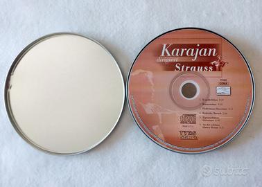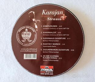 Karajan dirige Strauss. Etichetta: Tyrolis Music. CD contenente 6 brani fra i più famosi di Strauss, come Valzer Imperiale, Marcia Radetzky, Al Bellissimo Danubio Blu. Una totale immersione nell’atmosfera austriaca. La bellissima confezione rende questa edizione unica e introvabile. La scatola si è scolorita in alcuni punti ma il CD è perfetto. E’ un oggetto da collezione.