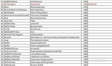Vendo per in utilizzo. Condizioni ottime. Posso inviare foto. CD Singolo €7, CD doppio €14. Titoli cd nelle foto. 883 AA.VV. ABBA ANTONACCI Biagio Audio 2 BENNATO Edoardo CELENTANO Adriano Cher CONCATO Fabio Counting Crows DE GREGORI Francesco FELICIANO José FURTADO Nelly HOUSTON Whitney JOVANOTTI Lorenzo KARLSSON Fridrik Kool & The Gang KRAVITZ Lenny LIEBERT Ottmar MILES Robert Mina Mina & Adriano Celentano Morcheeba Music from around the world Noa Pearl Jam PEZZALI Max PRAVO Patty R.E.M. RAMAZZOTTI Eros Red Hot Chili Peppers Roxette Snap Stadio STANSFIELD Lisa Tears For Fears VENDITTI Antonello ZARRILLO Michele ZERO Renato.