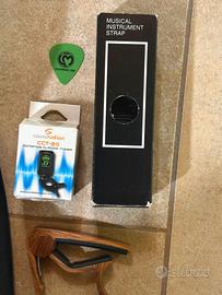 vendo chitarra in perfette condizioni, lunghezza 87cm, la vendo assieme alla sua custodia, ad un plettro, all’accordatore, agli straps, e ad un altro gadget di cui non ricordo ttil nome ma che si vede in foto. La vedo come nuova, mai usata, comprata quando ero più piccolo ma alla fine non ho mai imparato e ora la vendo per liberare spazio. non presenta difetti o segni d’usura o imperfezioni.