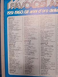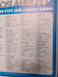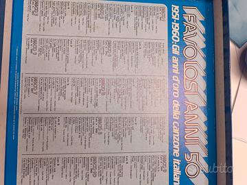 cofanetto di 10 vinili "i favolosi anni 50" ogni disco contiene un anno di canzoni italianedal 1951 al 1960. I vinili, come mostra la foto in allegato sono pari al nuovo, la copertina di carta invece, ha delle macchie dovute al naturale trascorrere del tempo.