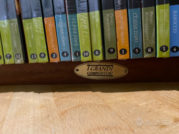 Bellissima collezione di CD di musica classica, completa di mensola in legno, la maggior parte dei cod sono ancora chiusi nel cellophane originale non sono mai stati utilizzati