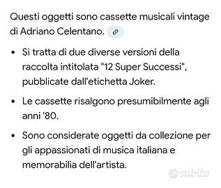 COPPIA DI AUDIOCASSETTE DA COLLEZIONE DI ADRIANO CELENTANO ANNI 70/80, OTTIME CONDIZIONI. SONO ENTRAMBE RACCOLTE DI CANZONI. PER UNA DESCRIZIONE PIÙ ACCURATA VEDERE LE FOTO