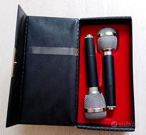 Coppia di microfoni Peiker, colore nero, in ottime condizioni. Venduti nella scatola originale completa. Ideali per karaoke, registrazioni o uso vintage da collezione.