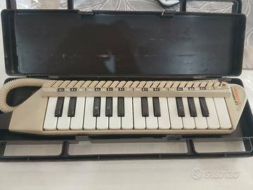 strumento musicale a fiato e tastiera conservato in una custodia nera rigida in plastica