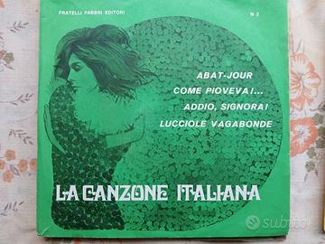 Dischi vinile 45 giri Romina Power, il ballo del qua qua Cicciottella Francis, California Gio La bella addormentata nel bosco La puntura Il grande mazinger Oliver onions, sheriff Heather Parisi, cicale Tonino pasquarelli, uomo stanco (privo di copertina) Cristina d'avena, John e solfami Gli atomini, ufo robot Maramao perché sei morto e altri brani (privo di copertina) Castellina pasi, il pettirosso (privo di copertina) Orchestra baiardo, tango e valzer George moustaki, lo straniero (privo di copertina) Gigi sabani, a me mi torna in mente una canzone (privo di copertina) Orchestra Montanari Zampa, Ciao cumparsita Gigi Principi, Lamento di una viola Sergio endrigo, canzone per te (Privo di copertina) Mina, l'importante è finire (privo di copertina) Milva, il mare nel cassetto Milva, flamenco rock La canzone italiana, ma le gambe , Non dimenticar le mie parole, Non sei più la mia bambina The minstrels, le colline sono in fiore Dalida, la danza di zorba Modugno, Dio come ti amo Domenico Modugno, che me ne importa a me Orietta Berti, dove non so Luciano taioli, scrivimi Nail Sedaca, non basta mai Sergio endrigo, il primo bicchiere di vino La canzone italiana, vipera, creola La canzone italiana, come le rose , eccetera La canzone italiana di, bombolo e altri brani La canzone italiana, valzer della povera gente La canzone italiana, reginella Campagnola La canzone italiana, balocchi e profumi e altri brani La canzone italiana, abat-jour ,Come pioveva, Addio signora , Lucciole vagabonde La canzone italiana, tango della gelosia, tango delle capinere La canzone italiana, signorinella , mattinata La canzone italiana, Nanni ,quanto è bello far l'amore quando è sera , arrivederci roma, canta se la vuoi cantar La canzone italiana, Notte di, maramao perché sei morto ,Ohi mari, ombretta La canzone italiana, La famiglia bambilla , sulla bici…. Bicicletta,Stella alpina, canta lo sciatore La canzone italiana, come la rose, chi siete ?, Cara piccina