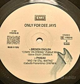 DISCHI MAXI VERSION 12’ IN VINILE (PROMO PER D. J) Vendo i seguenti Dischi Mix in Vinile 12’ (Maxi Version – Long Version) (Promo per Dee Jay) I dischi sono in buona condizione (tutti controllati). 01)PETER GABRIEL – SLEDGEHAMMER / PETER WHILE – SINFUL / IT’S IMMATERIAL – DRIVING AWAY FROM HOME 02)KOOL & YHE GANG – STONE LOVE / LEVEL 42 – RUNNING IN THE FAMILY 03)THEN JERICO – MUSCLE DEEP / ZUCCHERO FORNACIARI – RISPETTO / LEVEL 42 – LESSONS IN LOVE / JANET JACKSON – WHAT HAVE YOU DONE FOR ME LATELY 04)ARETHA FRANKLIN & GEORGE MICHAEL – I KNEW YOU WERE WAITING / EUROPE – ROCK THE NIGHT / EIGHT WONDER – WILL YOU REMEMBER / COLIN JAMES HAY – HOLD ME 05)INXS – NEW SENSATION / MAKE IT FUNKY TWO GUYS A DRUM MACHINE AND A TRUMPET / BIG PIG – HUNGRY TOWN 06)ERASURE – OH L’AMOUR / MILLIE SCOTT – PRISONER OF LOVE / SECRET SERVICE – WHEN THE NIGHT CLOSES IN 07)BROKEN ENGLISH – COMIN’ ON STRONG / PHAEAX – AND I’M STILL WAITING / MIXED EMOTION – YOU WAN’T LOVE / NINO BUONOCORE – SE FOSSI IN TE / KONO –NELL’INTIMO 08)BROS – DROP THE BOY / ROACHFORD – FAMILY MAN / PREFAB SPROUT – CARS AND GIRL / SADE – LOVE IS STRANGER THAN PRIDE 09)BRUCE WILLIS – RESPECT YOURSELF / THE COLOURFIELD – RUNNING AWAY 10)SABINE SABINE – CAT WALK / JACKIE QUARTZ – EMOTION / HERBIE HANCOCK – VIBE ALIVE 11)ENZO JACCACCI – POVERI CANTAUTORI / KATE – CARNIVAL / LIJAO – AMORE INTENSITA’ / ETNIKA – ONDARABIA 12)DANGEROUS – ALBA / CELABRATION – NOBODY’S PERFECT / ANGIE DYLAN – IN THE DARK / TWENTY POUNDS – DO IT FOR LOVE 13)AVANTGARDE –CALL ME LIAR / P.LION – YOU’LL NEVER BREAK MY HEARTH / TWO FOR US – GENERATION ING / SHEILAH CHAMBERD – HIT THE ROAD / PROXIMA – LIVIN’ IN ANOTHER WORLD 14)BLUE ZONE – THINKING ABOUT HIS BABY / BUSTER POINDEXTER – HOT HOT HOT 15)PEBBLES – GIRLFRIEND / NU SHOOZ – SHOULD I SAY YES? / MARYLIN MARTIN – POSSESSIVE LOVE / JIL JONES – FOR YOUR LOVE 16)EARTHA KITT – I DON’T CARE / SEA AND LAND – BILLIE JEAN Prezzo 10 euro cadauno