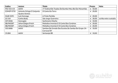 Dischi in vinile 33 giri di musica brasiliana; per dettaglio di numero di catalogo, autore, titolo e prezzo vedere l’elenco nelle immagini dell’annuncio; prezzo trattabile, sconto in caso di acquisto in blocco. Disponibili altri dischi negli annunci pubblicati nel mio profilo; generi: cantanti italiani, cantanti stranieri, classica, lirica, musica spagnola, musica brasiliana, colonne sonore Disney e fiabe, dischi 78 giri in bachelite dei primi del ‘900