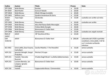 Collezione di dischi in vinile 33 giri di colonne sonore di film e cartoni animati Disney, altri cartoni animati e fiabe, tra cui alcune rarità d’epoca; per dettaglio di numero di catalogo, autore, titolo e prezzo vedere l’elenco nelle immagini dell’annuncio; prezzo trattabile, sconto in caso di acquisto in blocco. Disponibili altri dischi negli annunci pubblicati nel mio profilo; generi: cantanti italiani, cantanti stranieri, classica, lirica, musica spagnola, musica brasiliana, colonne sonore Disney e fiabe, dischi 78 giri in bachelite dei primi del ‘900
