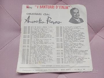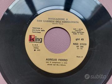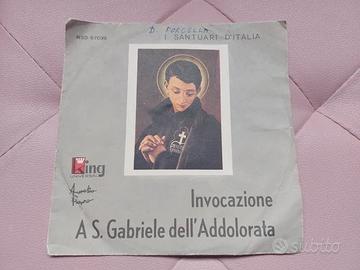 VENDO Disco 45 giri in vinile "I Santuari d'Italia: Invocazione a S. Gabriele dell'Addolorata" di Aurelio Fierro. Il disco è in buone condizioni, presenta alcuni lievi graffi, è funzionante. La custodia presenta evidenti segni di usura, come strappi, macchie, pieghe e una scritta. Prezzo 8 euro.