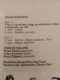 Vendo disco in vinile di Franz Schubert trio n.2 in mi Bem. magg. per pianoforte , violino e violoncello, Op.100 suonato dal trio di Milano B. Canino , pianoforte - C. Ferraresi , violino - R. Filippi , violoncello musica per amanti di questo genere e appassionati solo se interessati no perdi tempo rispondo tramite whatsapp e telefonicamente al numero 345 4986293