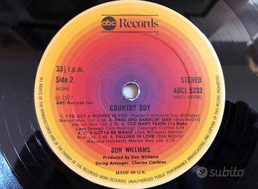 Don Williams – Country Boy ABC Records – ABCL 5233 Vinyl, LP UK 1977 Country Tracklist A1 I'm Just A Country Boy 3:01 A2 Lousiana Saturday Night 2:20 A3 Overlookin' And Underthinkin' 3:26 A4 Sneakin Around 2:40 A5 Look Around You 2:55 B1 I've Got A Winner In You 2:34 B2 Rake And Ramblin Man 2:50 B3 Too Many Tears (To Make Love Strong) 3:18 B4 It's Gotta Be Magic 2:48 B5 Falling In Love 2:15 Consegna a mano ROMA/EUR.