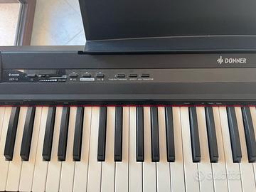 Donner DEP-10, 88 tasti semipesati, 128 voci di polifonia e 8 toni premium (pianoforte a coda, clavicembalo, organo e altro). Completo di pedali, leggio, supporto RockJam Xfinity (del valore di 45€) e altoparlanti stereo 25W, ideale per studenti e musicisti di ogni livello. Funzioni come modalità cuffia, metronomo integrato e porta MIDI USB per un’esperienza completa.