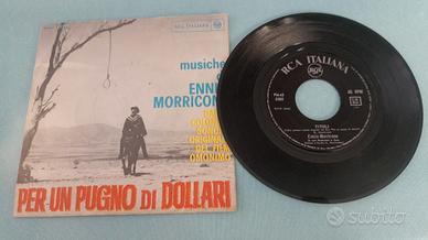 Vinile 45 giri con musiche di Ennio Morricone Dalla colonna sonora originale del film omonimo con Clint Eastwood. Contiene Per un pugno di dollari e Titoli. Dischi in ottime condizioni copertina con qualche segno del tempo ma condizioni buone