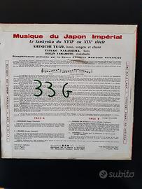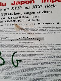 Musique du Japon Impérial. Genere: Sankyoku dal XVII al XIX secolo. Musiche di Shinichi Yuize, Yasuko Nakashima, Hozan Yamamoto. 1959. Dischi BAM LD 054, formato cm.25. Copertina sul retro con correzione della casa discografica. Scala di valore internazionale: VG+. Le foto fanno parte integrante della descrizione