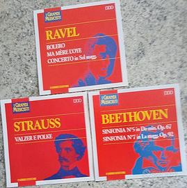 I grandi musicisti Fabbri editori 6 CD: Ravel: Bolero, Ma mère l’oye, Concerto in sol maggiore – Strauss: valzer e polke – Beethoven: Sinfonia n° 5 in do min. Op. 67 – Sinfonia in La magg. Op. 92 – Verdi: sinfonie e cori – Vivaldi: Le quattro stagioni – Ciaikovski: Lo schiaccianoci, Il lago dei cigni, La bella addormentata