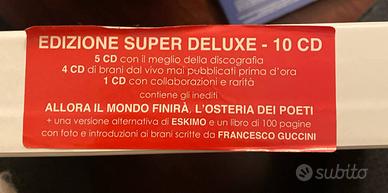 BOX SUPERDELUXE 10 CD (5 CD Best + 4 CD Live + 1 CD Rarità) con book di 100 pagine Il meglio dagli studio album, inediti riscoperti, collaborazioni e rarità, live introvabili, book con foto e introduzioni ai brani scritte dallo stesso Guccini… tutto in un’opera “monumentale”. Un lavoro di ricerca e valorizzazione di un patrimonio musicale vasto e sfaccettato per racconto in musica e un viaggio nella scrittura di uno dei cantautori più rappresentativi e amati del panorama musicale italiano. 5 CD Best Sudio: Selezione di brani da tutti gli album, da “Folk Beat N.1” del 1967 fino a “L’Ultima Thule” del 2012, effettuata dallo stesso Guccini. Contiene il brano inedito “Allora Il Mondo Finirà”, registrato per l’album di debutto e non inserito nella pubblicazione finale, e una versione alternativa di “Eskimo”. 4 CD Live: Selezione di brani registrati dal vivo dal 1992 al 2010 in presa diretta mai pubblicate prima d’ora. Contiene brani acustici registrati nel 1974 al Folkstudio di Roma (tra cui l’inedito “L’Osteria Dei Poeti”) e nel 1992 a Vienna, oltre a registrazioni dai concerti con la formazione storica. 1 CD di rarità e collaborazioni: Raccolta di canzoni di Guccini, o alle quali Francesco ha partecipato in qualità di ospite, pubblicate precedentemente in compilation o in album di altri artisti (tra cui Dalla, Morandi, Vecchioni, Mingardi, Avitabile e Modena City Ramblers) Contiene i brani strumentali “Nenè” e “Tema di Ju”, composti e registrati da Francesco per la colonna sonora del film “Nenè” di Salvatore Samperi, mai pubblicati su CD prima d’ora. Booklet: Esclusivo book di 100 pagine con foto d’archivio, un nuovo servizio fotografico inedito e introduzione scritta dallo stesso Francesco Guccini per ognuno dei brani contenuti nell’antologia!!!