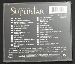 Jesus Christ Superstar (doppio CD) del 1996 è un'opera rock composta da Andrew Lloyd Webber con testi di Tim Rice. Definita come la migliore realizzazione musicale dell’opera con attori dalla voce meravigliosa come quella dei 3 interpreti pricipali: Joanna Ampil, Steve Balsamo e Zubin Varla. Si ispira alle vicende dell'ultima settimana della vita di Gesù (l'ingresso a Gerusalemme, il processo, la condanna a morte e la crocifissione) narrate dalla prospettiva originale del punto di vista di Giuda Iscariota, rappresentando il conflitto umano e ideologico tra i due personaggi. Dall'opera venne tratto il film Jesus Christ Superstar. Attori protagonisti; •Steve Balsamo as Jesus •Zubin Varla as Judas •Joanna Ampil as Mary Magdalene •David Burt - Pilate •Pete Gallagher - Caiaphas •Martin Callaghan - Annas •Glenn Carter - Simon •Alice Cooper as King Herod •Jonathan Hart - Peter Il miglior cast, produzione e composizione di sempre