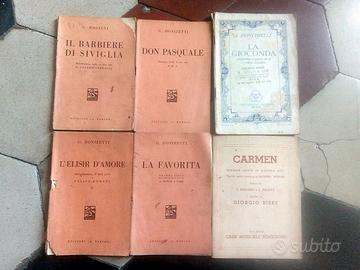 - Turandot 88 pg 1a ediz.Ricordi 1926 - La Boheme 82 pg ed. Ricordi 1923 - La Fanciulla del west + La boheme - St. lirica Pucciniana 1962- Torre del Lago - La Fanciulla del west 72 pg ed. Ricordi 1942 - Manon Lescaut 48 pg ed. Ricordi 1940 - Madama Butterfly 56 pg ed. Ricordi 1940 - Tosca 48 pg ed. Ricordi 1942 - Andrea Chenier + La Traviata (Teatro Politeama Viareggio st. lirica 1962) - Fedora 64 pg ed. Sonzogno 1942 - Loreley 48 pg ed. Ricordi - La Wally 60 pg ed. Ricordi 1942 - Faust 32 pg ed. Ricordi 1942 - L'amico Fritz 48 pg ed. Sonzogno 1942 - Cavalleria Rusticana 32 pg ed.Sonzogno 1940 - Carmen 48 pg ed. Sonzogno 1940 - La Gioconda 48 pg ed. Ricordi 1937 - La Favorita 32pg ed. A.Barion 1936 - L'Elisir d'Amore 32pg ed. A.Barion 1936 - Don Pasquale 32 pg ed. A.Barion 1936 - Il barbiere di Siviglia 32 pg ed. A.Barion 1937 - Pagliacci 32 pg ed. Sonzogno 1942 - L'Arlesiana 40 pg ed. Sonzogno 1938 - Adriana Lecouvreur 96 pg ed. Sonzogno 1939 - Mefistofele 48 pg ed. Ricordi 1964 - Mefistofele 36 pg ed. Ricordi 1942 - Otello 64 pg ed. Ricordi 1942 - Aida 32 pg ed. Ricordi 1940 - Rigoletto 32 pg ed. Ricordi 1942 - Il Trovatore 32 pg ed. Ricordi 1940 - La Traviata 32 pg ed. Ricordi 1942 - Nabucco 28 pg ed. Ricordi 1942 - Nabucco - Teatro comunale Firenze st. lirica 1954/55 - Ernani 32pg ed. Ricordi - Ernani Teatro Firenze st.1964/65 - Un ballo in maschera - Teatro Firenze st. lirica 1965/66 Tutti in buone/ottime condizioni, 120 euro in blocco