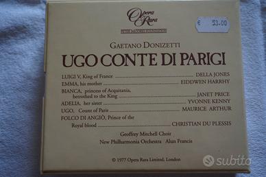 Box sigillato di Donizetti " Ugo conte di Parigi" Opera Rara 3 audio cd con libretto Cast Della Jones (Luigi V), Eiddwen Harrhy (Emma), Janet Price (Bianca), Yvonne Kenny (Adelia), Maurice Arthur (Ugo), Christian du Plessis (Folco di Angiò), Geoffrey Mitchell Choir, New Philharmonia Orchestra, Alun Francis – conductor. 25 euro