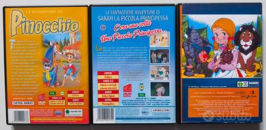 Lotto 3 DVD Cartoni Animati Classici. Include: Sarah la Piccola Principessa (Vol. 1): contiene i primi 3 episodi della storica serie TV. Edizione Avo Film. Le Avventure di Pinocchio: film d'animazione classico (Avo Film). Il Mago di Oz + Tarzan: doppio titolo, edizione Rai/Fabbri Editori. Nota sulle condizioni: I dischi sono in ottime condizioni. Le custodie presentano lievi segni di usura; in particolare quella di Sarah ha una piccola lesione sulla plastica esterna nell'angolo in basso a sinistra (visibile in foto), che non ne pregiudica la funzionalità.