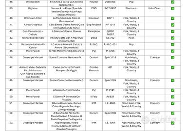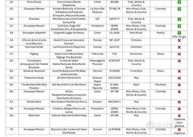 Lotto di 75 vinili, una varietà di generi e stili: Folk, Jazz, Pop, Reggae, Rock ⚠️ CONDIZIONI VARIE: • Condizioni varie: Alcuni dischi hanno copertina originale (✅), • Altri non hanno copertina (❌) • Formato: 45 giri • I dischi non sono stati testati singolarmente – suono non garantito 🎯 Ideale per: • Collezionisti di 45 giri • Appassionati di musica vintage • Chi cerca materiale da collezione o esposizione 💰 Vista la vendita in blocco e il contenuto del lotto, il prezzo è molto interessante. Contattatemi per maggiori informazioni.
