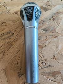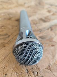 Microfono dinamico cardioide, caratterizzato da un robusto corpo in metallo con finitura cromata satinata.