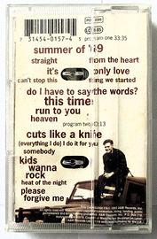 Musicassetta originale stereo dolby system- raccolta pubblicata nel 1993 dalla A & M Records Inc. Los Angeles USA-produttore: Bryan Adams/Bob Clearmountain Brani musicali: Lato A) 1. Summer of '69- 3:35 (da Reckless) 2. Straight from the Heart- 3:30 (da Cuts Like a Knife) 3. It's Only Love- 3:15 (da Reckless) 4. Can't Stop This Thing We Started- 4:29 (da Waking Up the Neighbours) 5. Do I Have to Say the Words? - 6:11 (da Waking Up the Neighbours) 6. This Time - 3:18 (da Cuts Like a Knife) 7. Run to You- 3:54 (da Reckless) Lato B) 8. Heaven- 4:03 (da Reckless) 9. Cuts Like a Knife- 5:16 (da Cuts Like a Knife) 10. (Everything I Do) I Do It for You- 6:34 (da Waking Up the Neighbours) 11. Kids Wanna Rock - 2:36 (da Reckless) 12. Heat of the Night - 4:43 (da into the Fire) 13. Please Forgive Me- 5:56 (Inedita) valutazione: custodia : ottimo musicassetta : ottimo