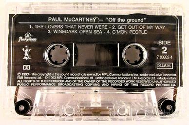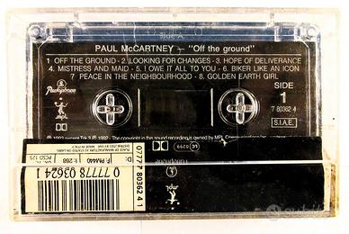 Musicassetta originale del 1993 - Paul Mc. Cartney – OFF THE GROUND Musicassetta originale in dolby sound del 1993 – etichetta EMI/PARLOPHONE – made in Italy - Brani musicali: Lato A: 1)- OFF THE GROUND; 2)- LOOKING FOR CHANGES; 3)- HOPE OF DELIVERANCE; 4)- MISTRESS AND MAID; 5)- I OWE IT ALL TO YOU; 6)- BIKER LIKE AN ICON; 7)- PEACE IN THE NEIGHBOURHOOD; 8)- GOLDEN EARTH GIRL; Lato B: 1)- THE LOVERS THAT NEVER WERE; 2)- GET OUT OF MY WAY; 3)- WINEDARK OPEN SEA; 4)- C' MON PEOPLE; VALUTAZIONE: CUSTODIA : OTTIMO MUSICASSETTA : OTTIMA