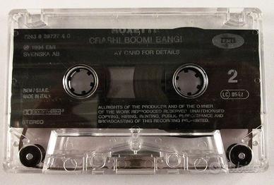 Musicassetta originale del 1994-Roxette-crash!boom!bang! Musicassetta originale stereo dolby system-etichetta EMI Svenska-album registrato nel 1994 presso gli studi EMI di Stoccolma-Svezia/May fair Studios di Londra-Inghilterra/Capri Digital Studios, Isola di Capri-Italia/Tits & Ass Studios, Halmstad-Svezia. Prodotto da Clarence of Werman per Carlos Government Music- Roxette è: Mario Fredriksson & Per Gessle. Brani musicali: Lato A) 1. Harleys & Indians (Riders in the Sky) - 3:45 2. Crash! Boom! Bang! - 5:02 3. Fireworks - 3:58 4. Run to You - 3:39 5. Sleeping in My Car - 3:47 6. Vulnerable- 5:03 7. The First Girl on the Moon - 3:11 8. Place Your Love - 3:09 Lato B) 9. I Love the Sound of Crashing Guitars - 4:49 10. What's She Like? - 4:16 11. Do You Wanna Go the Whole Way? - 4:11 12. Lies - 3:41 13. I'm Sorry - 3:10 14. Love is All (Shine Your Light on Me) - 6:41 15. Go to Sleep - 3:58 valutazione: cofanetto : ottimo musicassetta : ottimo
