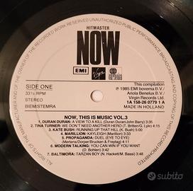 Now this Is music 3 - doppio LP del 1985 con il meglio dei successi pop e rock di quell'anno. Dai Duran Duran a Kate Bush, da Huey Lewis & the News agli U2 e molti altri. Difetti della copertina e di una delle custodie di carta, che ha un angolo piegato. I due vinili sono in buone condizioni. Qualche leggero graffio che non ne pregiudica l'ascolto.
