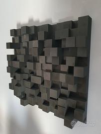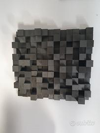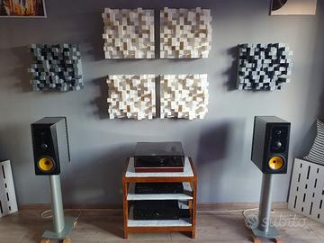 Pannelli acustici diffusori skyline per alte frequenze, servono a rompere e ottimizzare le riflessioni della stanza. Misurano 45,5 cm X 42 cm X 7 cm, costruiti in plastica atossica peso 1 kg , dotati di 2 fori per essere appesi come quadri. Range di lavoro di frequenze da 900 hz a 5500 hz. In foto nero opaco. *PREZZO 1 PANNELLO* Disponibili anche bianco , sabbia e grigio opaco. *POSSIBILITÀ DI AVERE PANNELLI DI COLORI DIVERSI SE POSSIBILE* • Non bloccano il suono come i pannelli fonoassorbenti che tolgono delle frequenze( chi sa quali), ma lo "rompono" e lo redistribuiscono in direzioni multiple, prevenendo echi e riverberi localizzati. • Design basato su matematica: Le altezze delle torrette seguono un calcolo matematico preciso (resto quadratico), che ne determina l'efficacia su specifiche bande di frequenza. • Effetto sulla stanza: Trasforma un suono "piatto" in uno più tridimensionale, dando profondità e posizione agli strumenti, come se fossero "in aria". • Posizionamento: Spesso posti sulla parete posteriore, ma utili anche su pareti laterali e soffitti, dietro l'area d'ascolto, in sistemi hi-fi, studi di registrazione, home theater e sale prova. INFORMAZIONI SUL POSIZIONAMENTO: Se posizionati nelle pareti laterali nei primi punti di riflessione dei diffusori ( basta far posizionare una persona con uno specchio e vedere nello specchio i diffusori rflessi, quello è un punto di prima riflessione) riescono ad aprire la scena, dando l'impressione che la stanza sia molto più grande. Utilissimi anche se posizionati alle spalle delle casse e al centro tra le casse. Mbl, mcintosh, mark levinson, krell, audio research, classe, sonus faber, velodine, pathos, thorens, testina mm mc, dac, meccanica, topping, rme, aloia, jeff rowland, velodine, finali mono, magneplanar, marantz, pioneer, sony, spectral, acapella, mastersound, linn, solid steel, cavi di potenza segnale, symphonic line, musical fidelity, unison research, no pannelli fonoassorbenti.