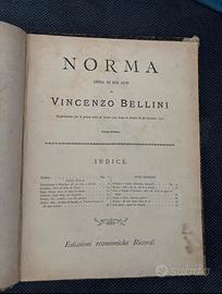 Spartito d’opera antico edizione Ricordi, fine ‘800 . Contenente tre opere: Mosè in Egitto di G. Rossini, Barbiere di Siviglia di G. Rossini, Norma di V. Bellini. Per canto e pianoforte.