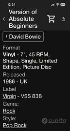 Picture disc formato 7” (di forma quadrata) David Bowie - “Absolute beginners” , UK 1986.