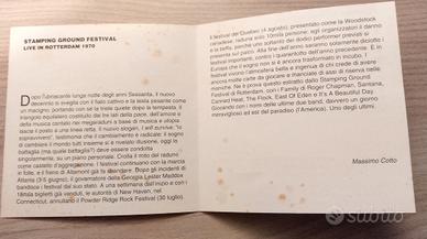 CD registrato allo Stamping Ground Festival Live in Rotterdam 1970, con brani dalle esibizioni di Santana, Canned Heat, East of Eden, It's A Beautiful Day, The Flock e Family, per la serie Il Dizionario del Rock della Curcio Editore. CD in ottime condizioni. Libretto con macchie come da foto che non pregiudicano la lettura.