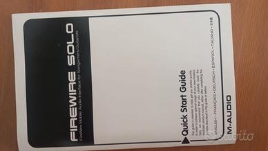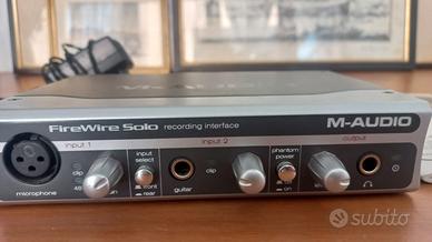Interfaccia audio M-Audio FireWire Solo. Tipo: Interfaccia audio portatile per registrazione digitale via FireWire. Ingressi: Include un ingresso microfonico XLR bilanciato con alimentazione phantom e un ingresso strumento da 1/4" sul pannello frontale. Qualità Audio: Supporta una risoluzione fino a 24-bit / 96 kHz. Connettività: Dispone di due porte FireWire per il collegamento in cascata e uscite di linea.