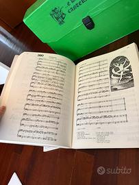Collezione di spartiti per canti da chiesa per qualsiasi funzione religiosa, composta da tre volumi “danzando canteranno” con valigetta a corredo e due piccoli libretti in omaggio. Perfetti per qualsiasi strumento, tenuti in ottime condizioni e usati veramente poco.