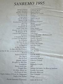 Testi e musiche delle canzoni di Sanremo 1995 con indicati anche gli accordi sul manico della chitarra. Artisti maggiori, Loredana Bertè, Bocelli, Grignani, mango Fiorello, Ivana Spagna Patty Pravo Morandi, Ranieri, Lorella Cuccarini, Toto Cutugno, Drupi e se ne sono molti altri, beh, li ritrovate tutte nella seconda foto che ho fatto.