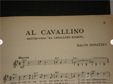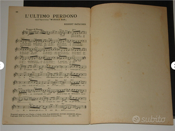 Descrizione e caratteristiche: spartito musicale - partition musicale melodie d'operette - volume 1 Brani scelti (23) per canto, mandolino, violino o fisarmonica delle più famose operette di Strauss, Abraham, Katscher e molti altri. Edizioni Suvini Zerboni. Sul retro è stampata la data 1950. Dimensioni: 25 x 17 cm. Condizioni: In buono stato di conservazione, con lieve usura/piccolo strappo lungo i bordi della copertina e sul taglio ma in generale non ha risentito particolarmente del peso degli anni. Testo interamente fruibile. Timbri sia sul retro che in una pagina interna. Macchiette giallastre di umidità maggiormente concentrate nella parte finale. Segnetto di matita nella parte inferiore destra del retro copertina.