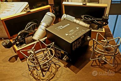 Vendo coppia di microfoni valvolari The t. bone, modello "SCT2000". Ognuno di questi ha la rispettiva custodia in legno e conservati nelle valigie originali contenenti un alimentatore/commutatore, un cavo XLR a 7-pin, uno shock-mount ed elastici di ricambio per quest'ultimo.