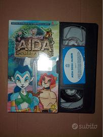 Vhs AIDA DEGLI ALBERI. La videocassetta è un omaggio per le merendine, come si legge in foto. Custodia in cartoncino con, sulla facciata principale, una piccola scritta a penna, come si vede in foto.