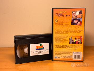 Videocassetta VHS originale Disney del film “Il Gobbo di Notre Dame”. Custodia rigida nera con copertina illustrata. La videocassetta presenta etichetta Disney Video con titolo e durata.