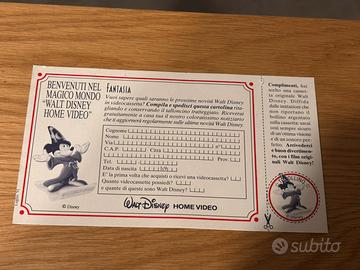DESCRIZIONE: Vendesi videocassetta originale del capolavoro Disney Fantasia, edizione novembre 1991. L'oggetto è completo di: • Custodia originale in buone condizioni estetiche, ha una lesione sulla parte anteriore ma non ha rovinato la stampa interna • Cartolina di iscrizione al "Magico Mondo Walt Disney" (luglio '91) perfettamente conservata e non compilata. ⚠️ NOTA IMPORTANTE SULLE CONDIZIONI: Il nastro presenta evidenti tracce di muffa sulle bobine interne (vedi foto). La cassetta viene venduta esclusivamente come oggetto da esposizione, per collezionismo di memorabilia o per recupero dei materiali cartacei. Se ne sconsiglia l'inserimento in un videoregistratore senza una previa pulizia professionale del nastro per evitare danni alle testine.
