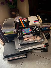 Le videocassette presenti nell'immagine includono titoli di film come Pearl Harbor e Sister Act, oltre a cassette vergini di marche come Maxell e Fuji.