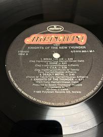 L'immagine mostra la copertina del vinile di "Knights of the New Thunder" del gruppo heavy metal norvegese TNT. L'album è stato pubblicato nel 1984.