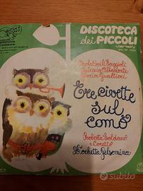 15 vinili 45 giri con custodia. Musica per bambini: Furia, 3 civette sul comò, El Merendero, Lassie, La piccola fiammiferaia, I vestiti dell'Imperatore, Terra mia, Le musiche di carosello, Un micio in orchestra, Mi scappa la pipì papà, Dolce cara mammina, e atri.
