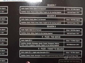 Vendo serie di X-Files, 9 stagioni più 2 film. Comprato da poco, lo rivendo perchè quando ho fatto l'acquisto non mi ero accorto che la stagione 1 fosse in inglese. Quindi, come potete vedere dalle foto, la prima stagione e i due film sono in inglese, NON in italiano. Le altre stagioni invece sono anche in italiano.